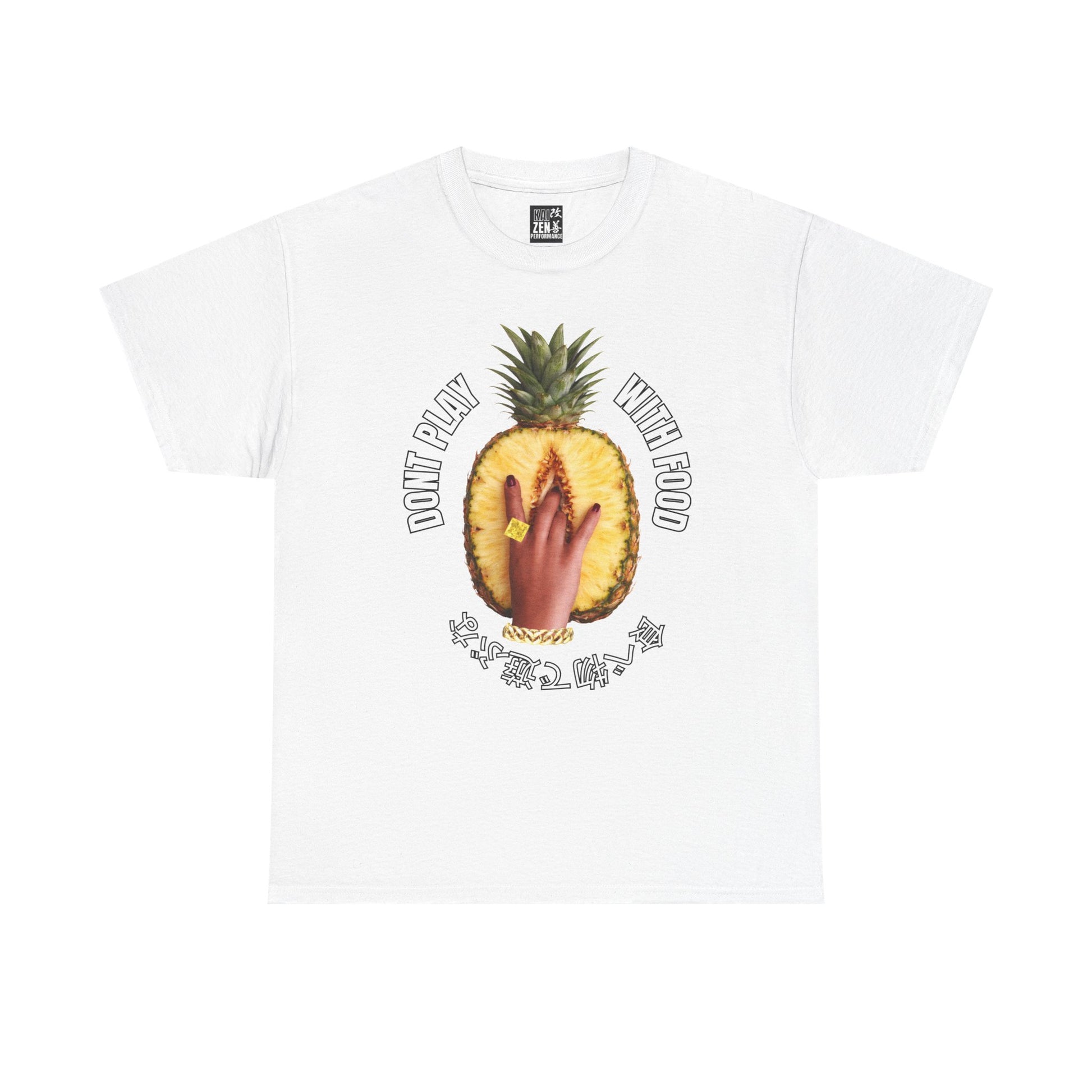A relaxed, vintage-feel tee that channels playful, snack‑centric energy. Soft, medium-weight cotton drapes easily while the bold pineapple-and-hand graphic makes a cheeky statement: 'Don’t Play With Food' rendered with slightly distressed, retro tones. Wear it to casual meetups, farmers’ markets, or lazy weekends when you want comfortable fabric and a wink of personality. The classic crew neck and roomy fit let the print sit front-and-center, while the tear-away label and reinforced shoulders keep it feeling lived-in but reliable. It’s the kind of shirt you reach for when you want something effortless that still sparks a smile.
